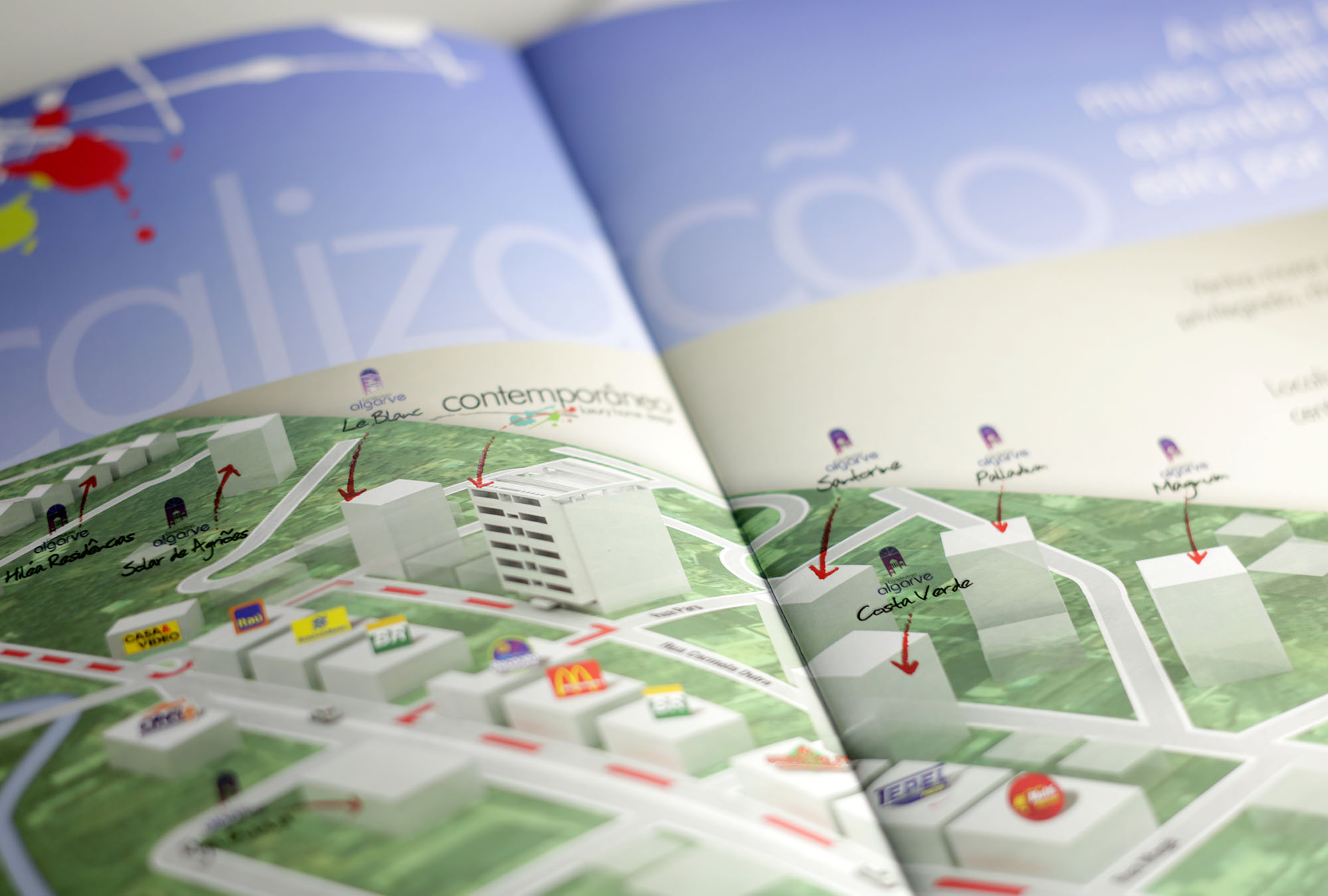 Criação de identidade visual e campanha para lançamento de empreendimento imobiliário residencial Contemporâneo, contemplando book, folheteria, hotsite, decoração temática para stand e sinalização direcional.