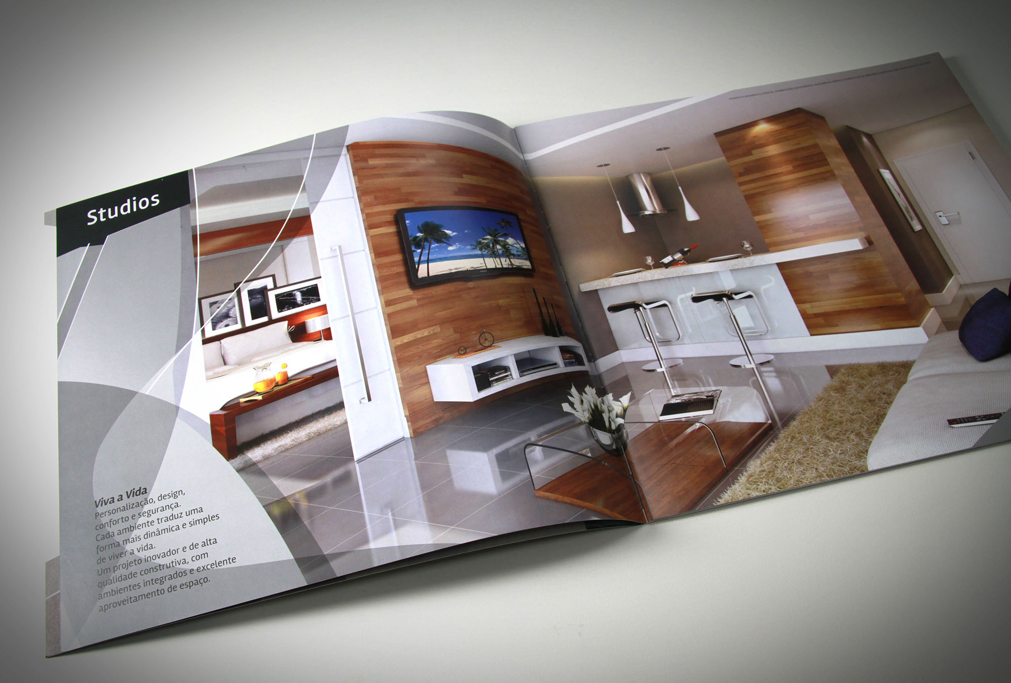 Criação de identidade visual e campanha para lançamento de empreendimento imobiliário residencial Studio Portinari, contemplando book, folheteria, hotsite, decoração temática para stand e sinalização direcional.