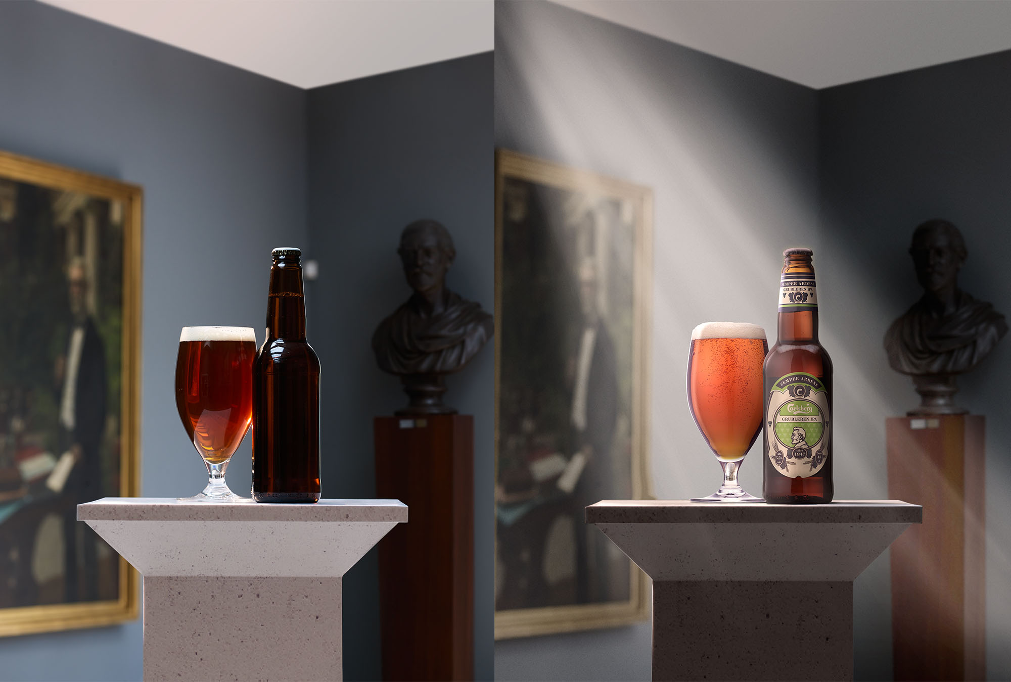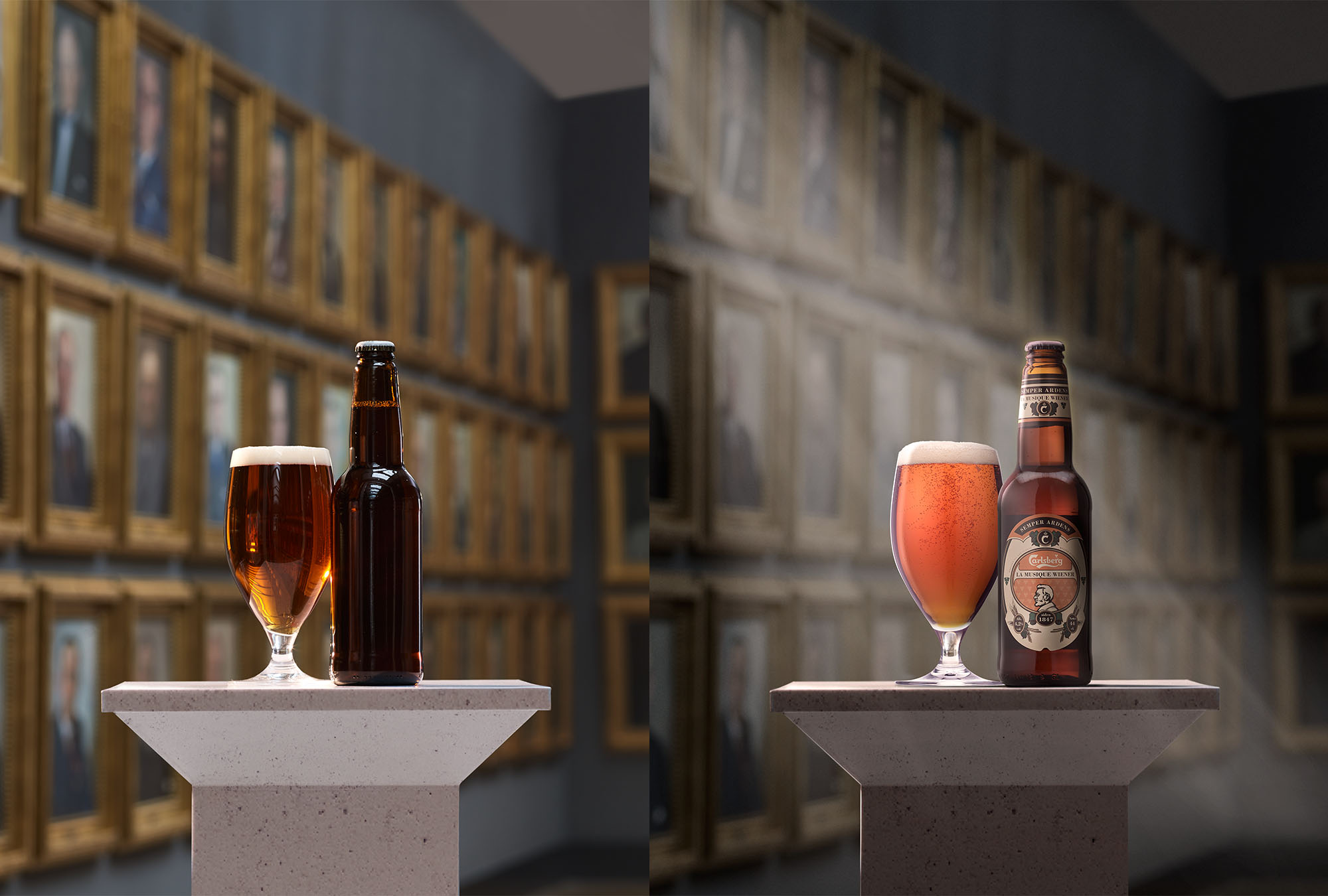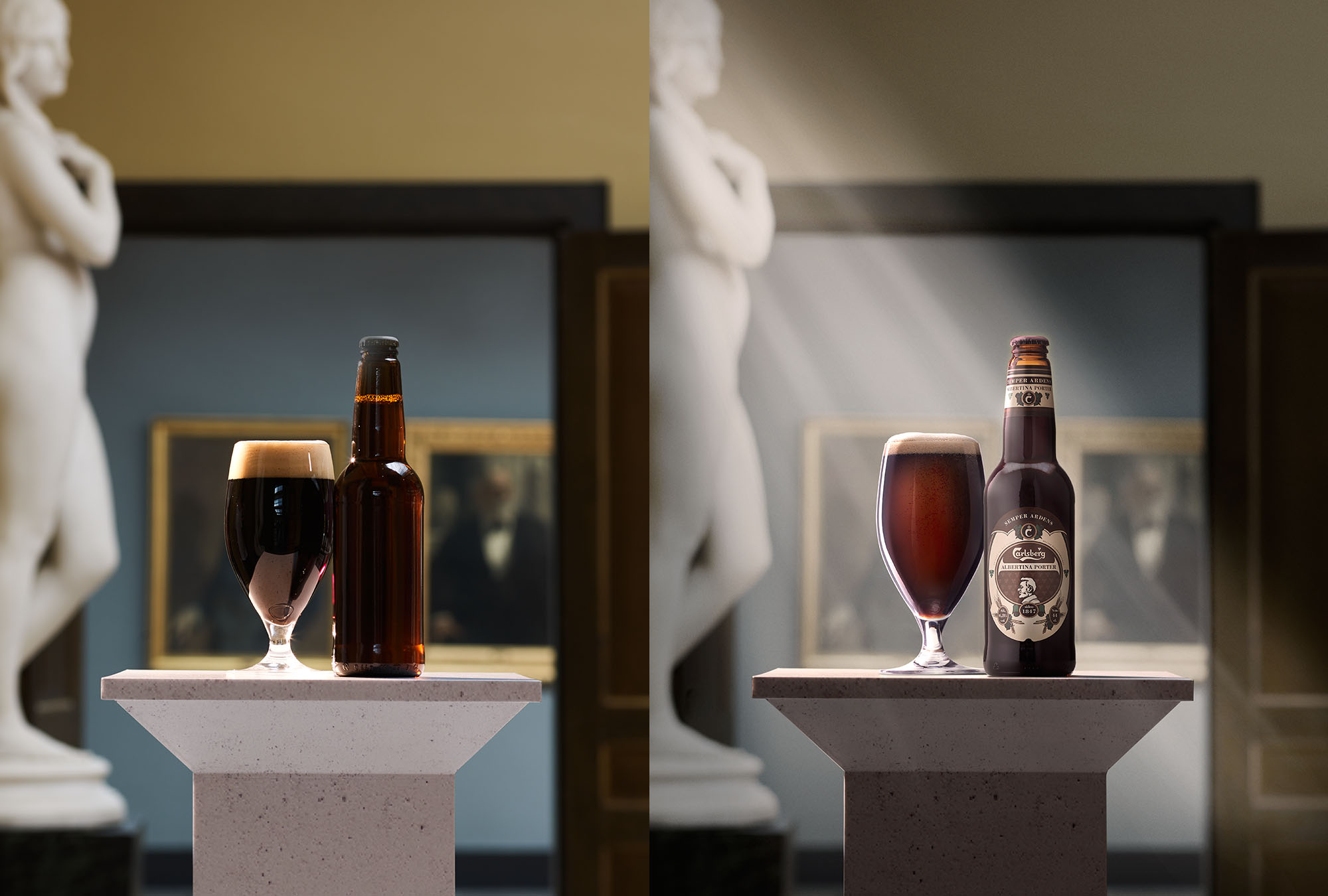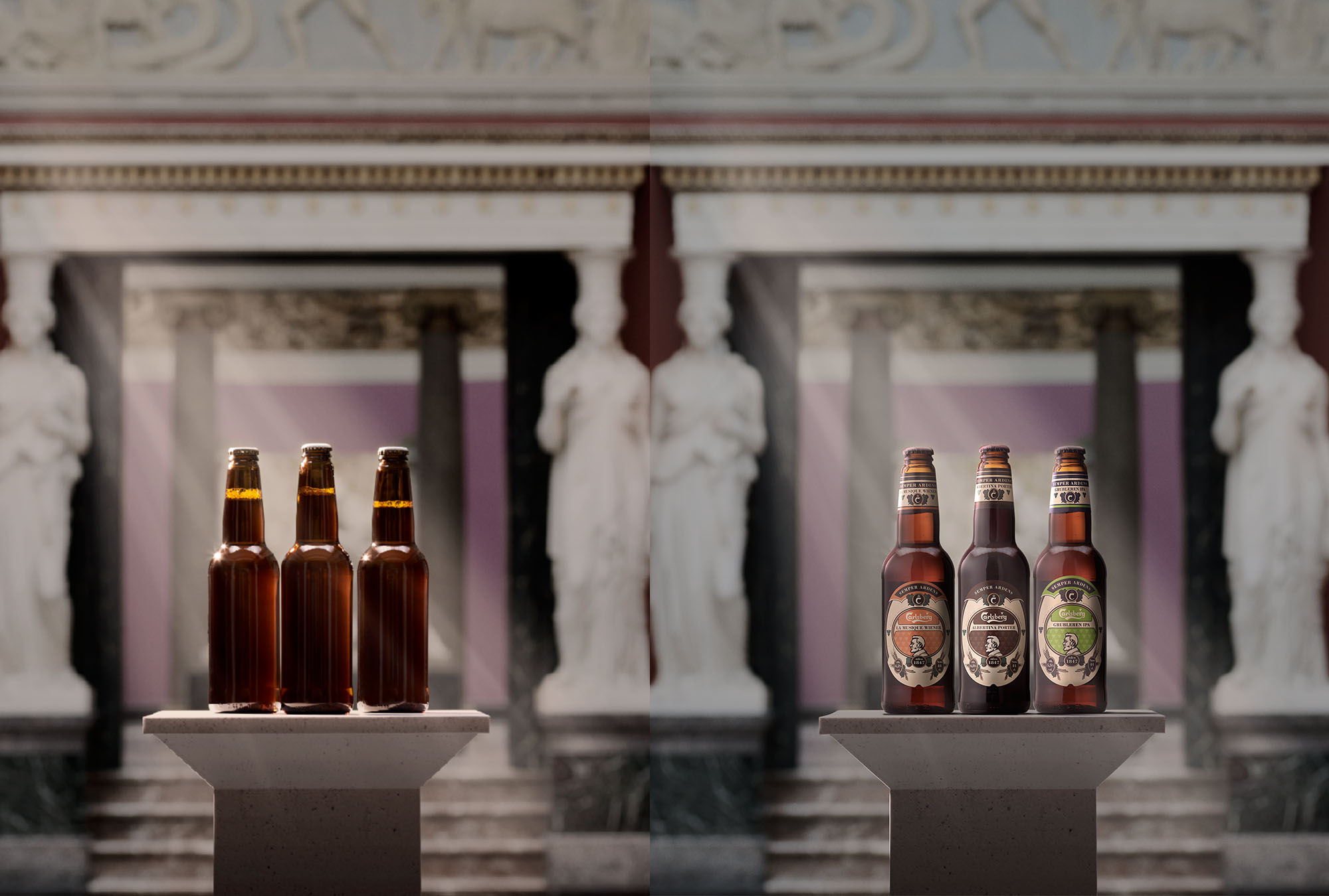Manipulação de imagens para Carlsberg com aplicação de rótulos nas garrafas e nova iluminação para a cena proporcionando um efeito mais dramático na imagem.