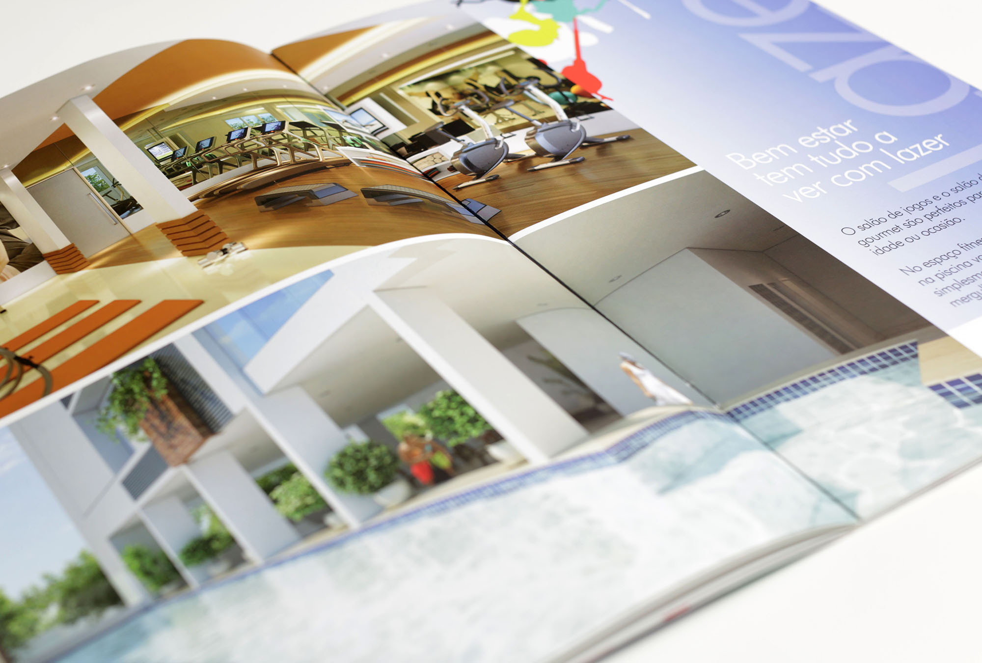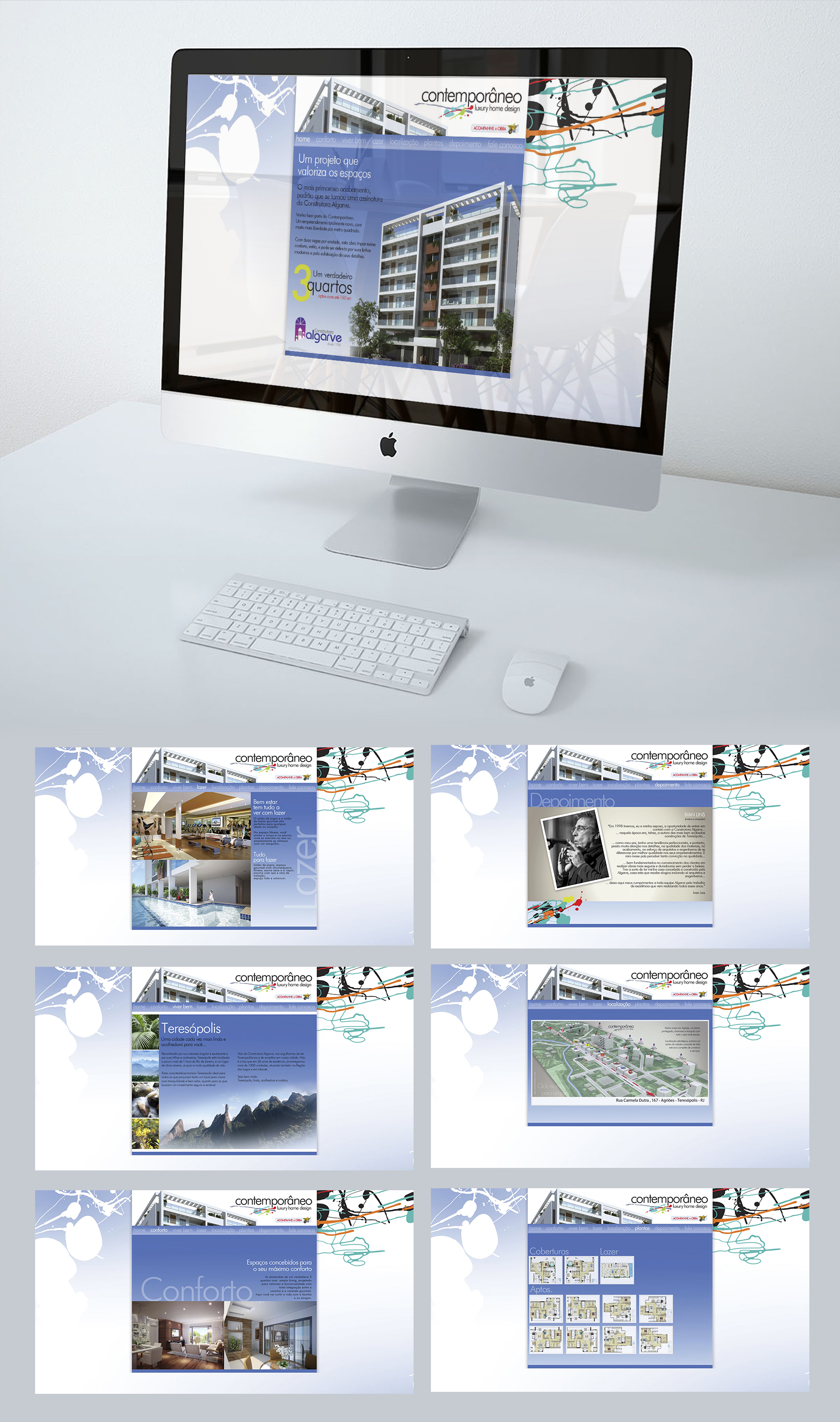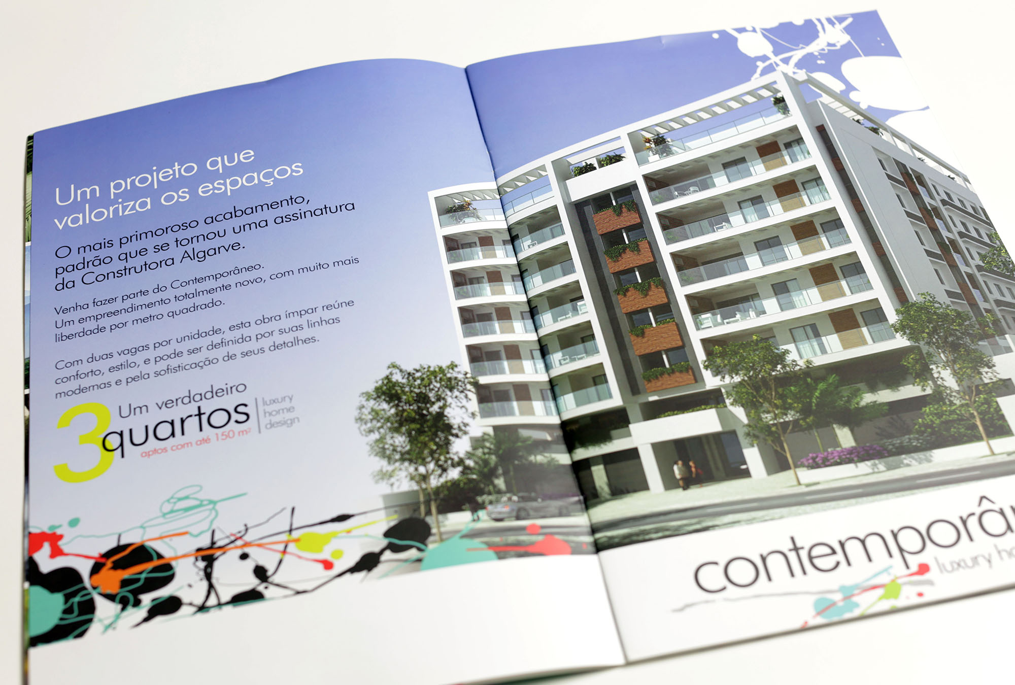 Criação de identidade visual e campanha para lançamento de empreendimento imobiliário residencial Contemporâneo, contemplando book, folheteria, hotsite, decoração temática para stand e sinalização direcional.