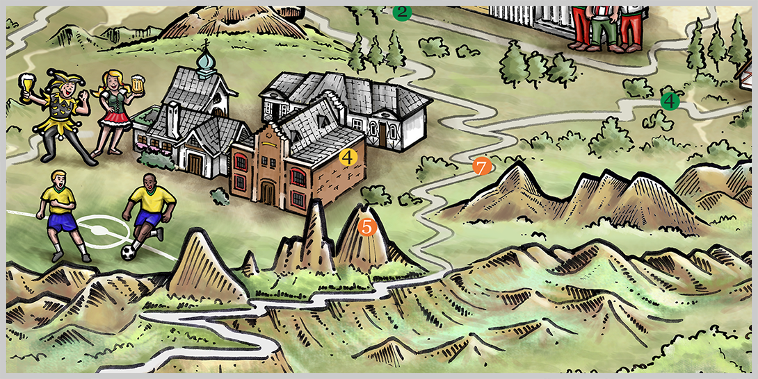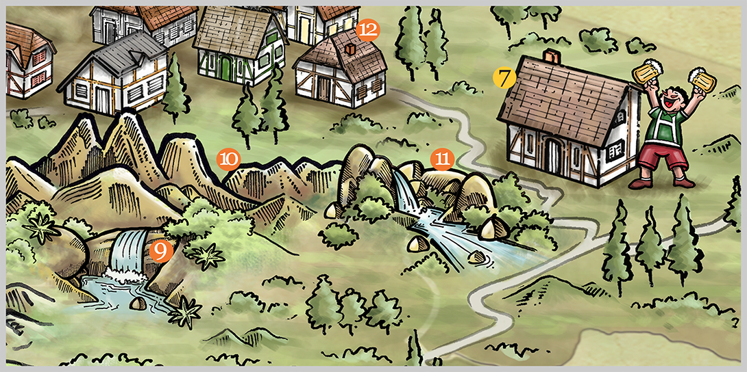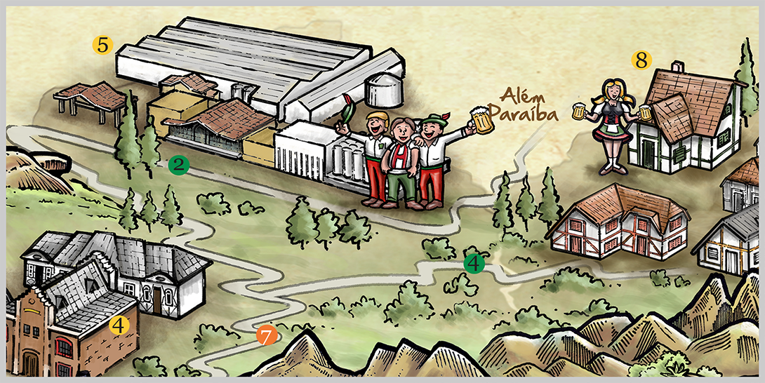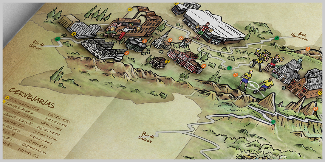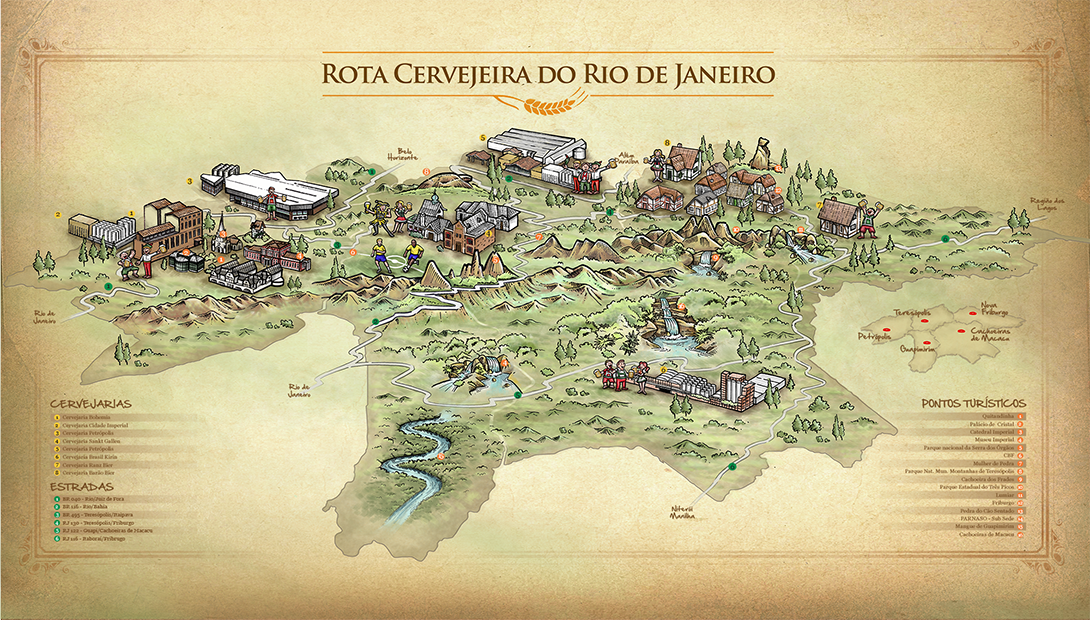 Ilustração temática para ACERJ, apresentando a Rota Cervejeira junto a região serrana do Rio de Janeiro.